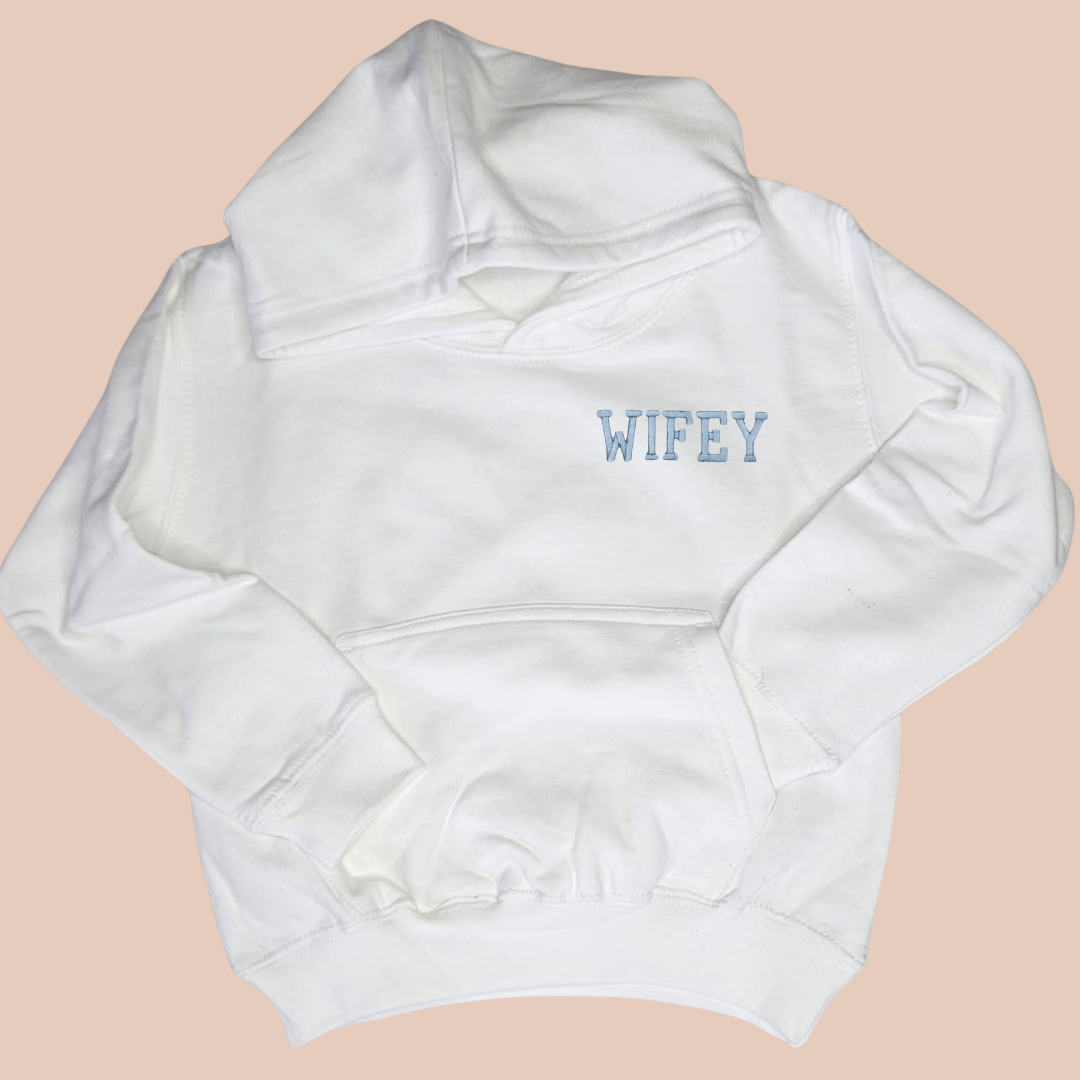 Celebrate love in style with our Wifey Embroidered Sweater or Hoodie. Featuring the word "Wifey", you can choose to have it placed on the left breast for a subtle look or in the center. Perfect for newlyweds heading off on their honeymoon, a thoughtful gift for your wife, or to celebrate an anniversary – or simply because you're in love!