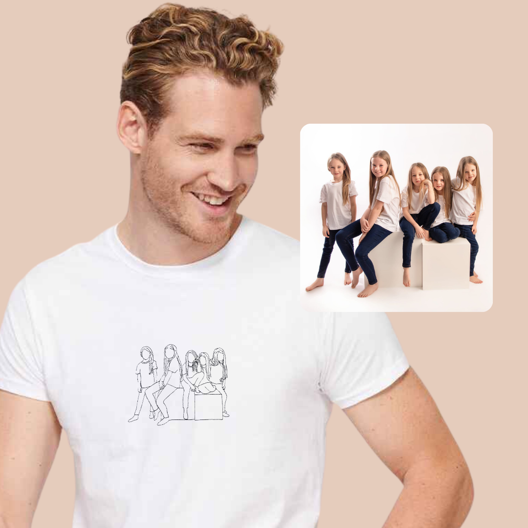 Transform cherished memories into wearable art with our custom memory embroidered adult T-shirt. Simply upload a photo of a loved one, pet, or special moment, and we'll turn the image into an outlined drawing, then digitise it into a beautiful embroidery stitch pattern. Each piece is one of a kind, made uniquely for you.