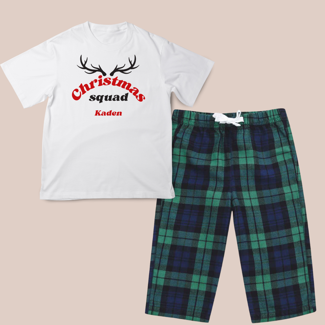 Join the festive fun with our personalised "Christmas Squad" printed PJs! Featuring the bold "Christmas Squad" text topped with playful antlers, these pyjamas are perfect for spreading festive cheer. Personalise them with your name underneath to make them truly unique. Choose your favorite top colour and pair it with either red or green tartan bottoms for a cosy, festive look. Available for infants, children, and adults, these PJs are perfect for matching the whole family and creating unforgettable memories.