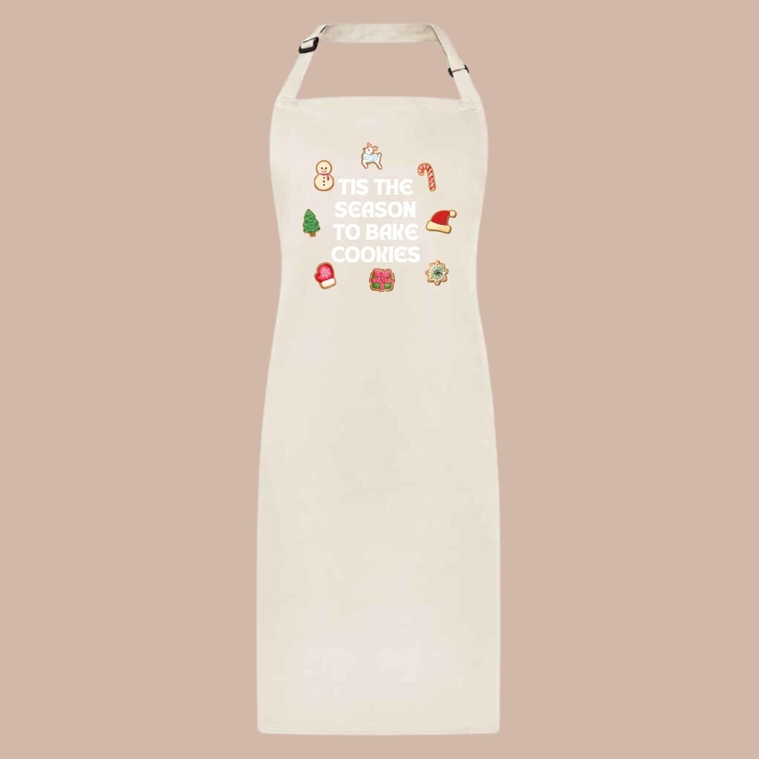 Get your little ones ready for festive baking fun with our charming Christmas printed apron! Adorned with the playful phrase "Tis the Season to Bake Cookies," this apron is surrounded by an array of festive cookies that will inspire joy and creativity in the kitchen