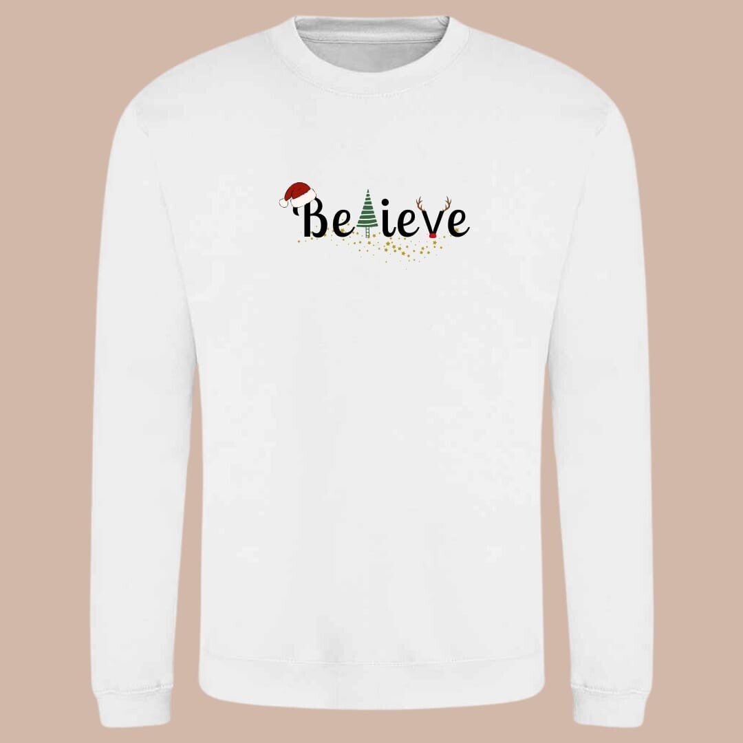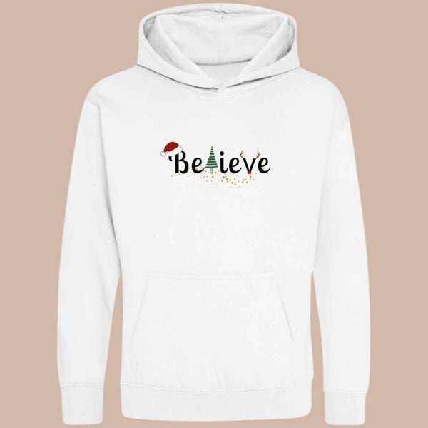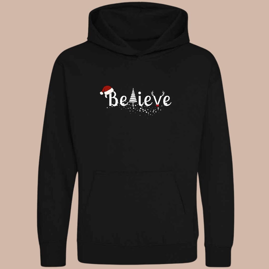 Embrace the magic of the season with our festive "Believe" sweater or hoodie! Playfully designed, this lovely piece features the word Believe with charming Christmas details: a Santa hat perched on the "B," a Christmas tree forming the "L," and the "V" topped with reindeer antlers and a red nose. Below, a swirl of twinkling stars adds an extra sprinkle of Christmas magic. Available in a variety of garment and print colours, this sweater or hoodie is perfect for spreading joy and warmth all season long. Make every moment merry and bright!