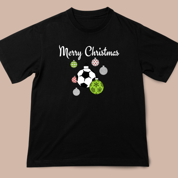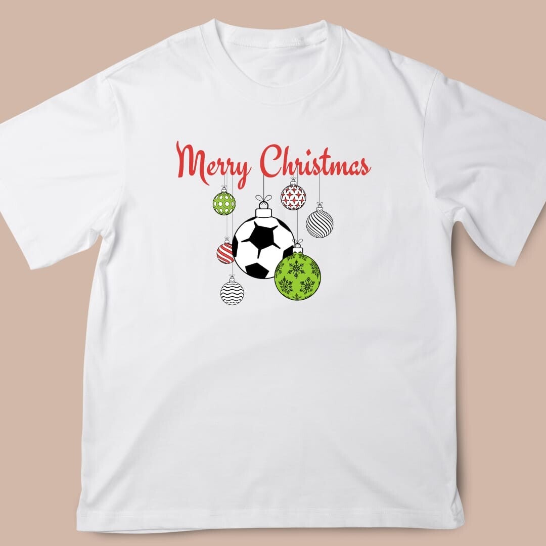 Get into the festive spirit with our Christmas "Merry Christmas" T Shirt! This piece features the words Merry Christmas adorned with hanging baubles, including a unique football-style bauble as the centerpiece. Available in various garment and print colour combinations, this piece makes a stylish and fun addition to your festive wardrobe. Perfect for christmas gatherings, family photos, or days in, it’s the ultimate Christmas wardrobe essential for sport lovers and Christmas enthusiasts alike!