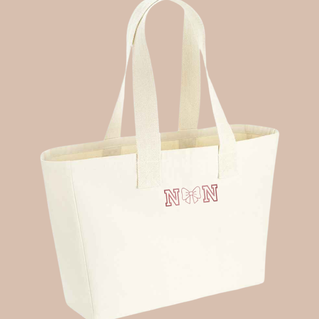 Show your love with a touch of sweetness! Our Embroidered Mum/Nan Canvas Bag lets you personalise a stylish tote with "Mum" or "Nan" in a charming collegiate font, featuring a cute bow in place of the middle letter. Choose your favorite tote and thread colours to create a truly special gift.